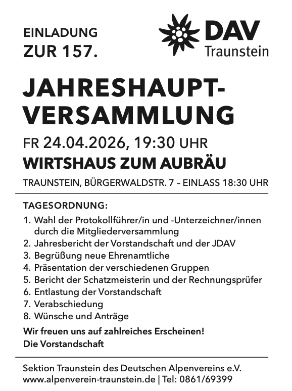 Wir laden alle unsere Mitglieder zur Jahreshauptversammlung am Freitag, den 24.04.2026 um 19:30 im Wirtshaus zum Aubräu ein. Kommts vorbei, wir freuen uns über rege Teilnahme. Die Ehrungen der langjährigen Mitglieder finden wie immer in einer separaten Veranstaltung statt.